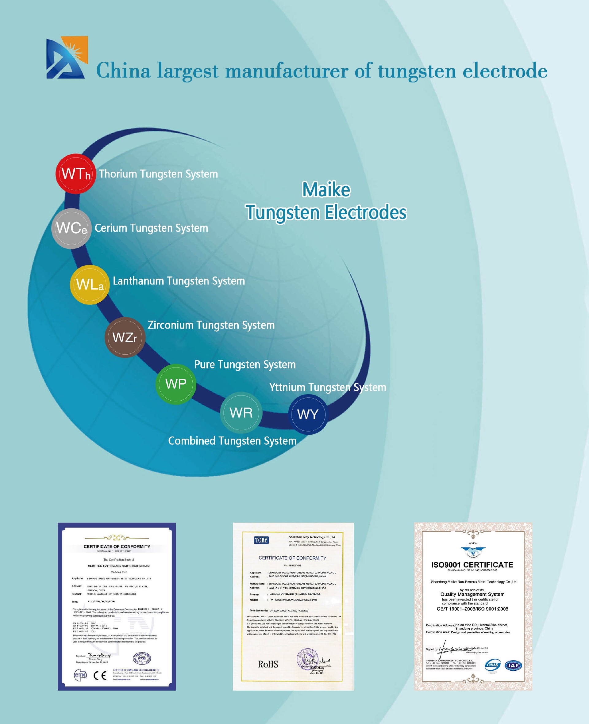 It is widely used as an additive oxide electrode ,having much more advanced comprehensive welding performance than the properties of Pure Tungsten Electrode and other additive oxide electrodes. It can not be replaced by other oxide electrodes during the long use process. It can be operated easily and current load is high .It can produce arc easily and steadily ,and the gap of the breaking arc is big ,loss less and long life .It has much higher recrystallizing temperature, much better conductivity and better mechanical cutting property .It is used for welding carbon steel, stainless steel, nickel alloy and titanium metal. It is the first selection material for high quality welding.